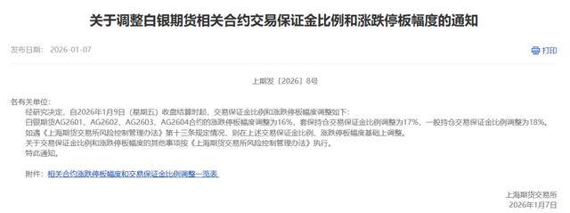 自2026年1月9日(星期五)收盘结算时起,交易保证金比例和涨跌停板幅度调整如下:白银期货AG2601、AG2602、AG2603、AG2604合约的涨跌停板幅度调整为16%,套保持仓交易保证金比例调整为17%,一般持仓交易保证金比例调整为18%。