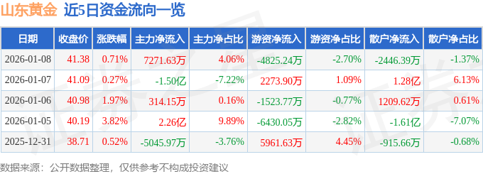 证券之星消息,截至2026年1月8日收盘,山东黄金(600547)报收于41.38元,上涨0.71%,换手率1.2%,成交量43.28万手,成交额17.89亿元。