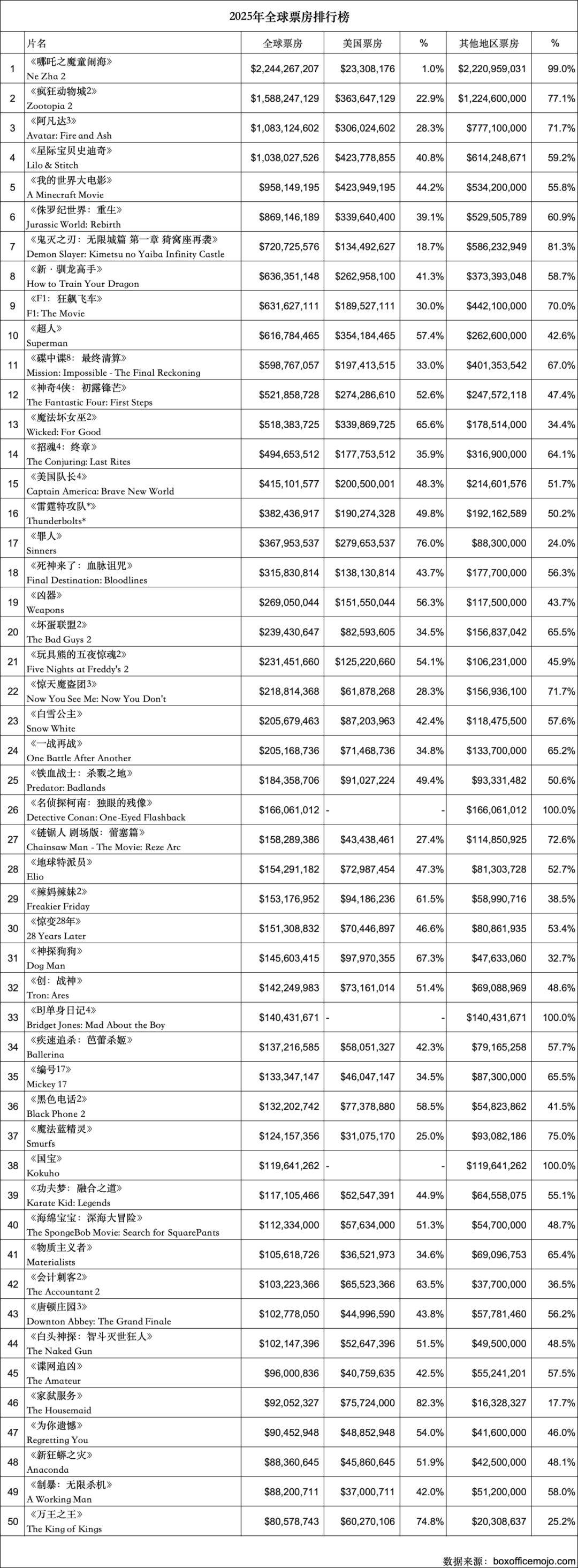 中国仍是除美国之外的全球最大国际电影市场,而这一市场很大程度上要归功于一部电影:《哪吒之魔童闹海》。这部动画影片于2025年1月下旬在中国上映,最终以154.4亿元人民币(超过22亿美元)的票房成为中国影史上票房最高的电影,同时也是2025年全球票房最高的电影,以及全球影史票房第五高的电影。