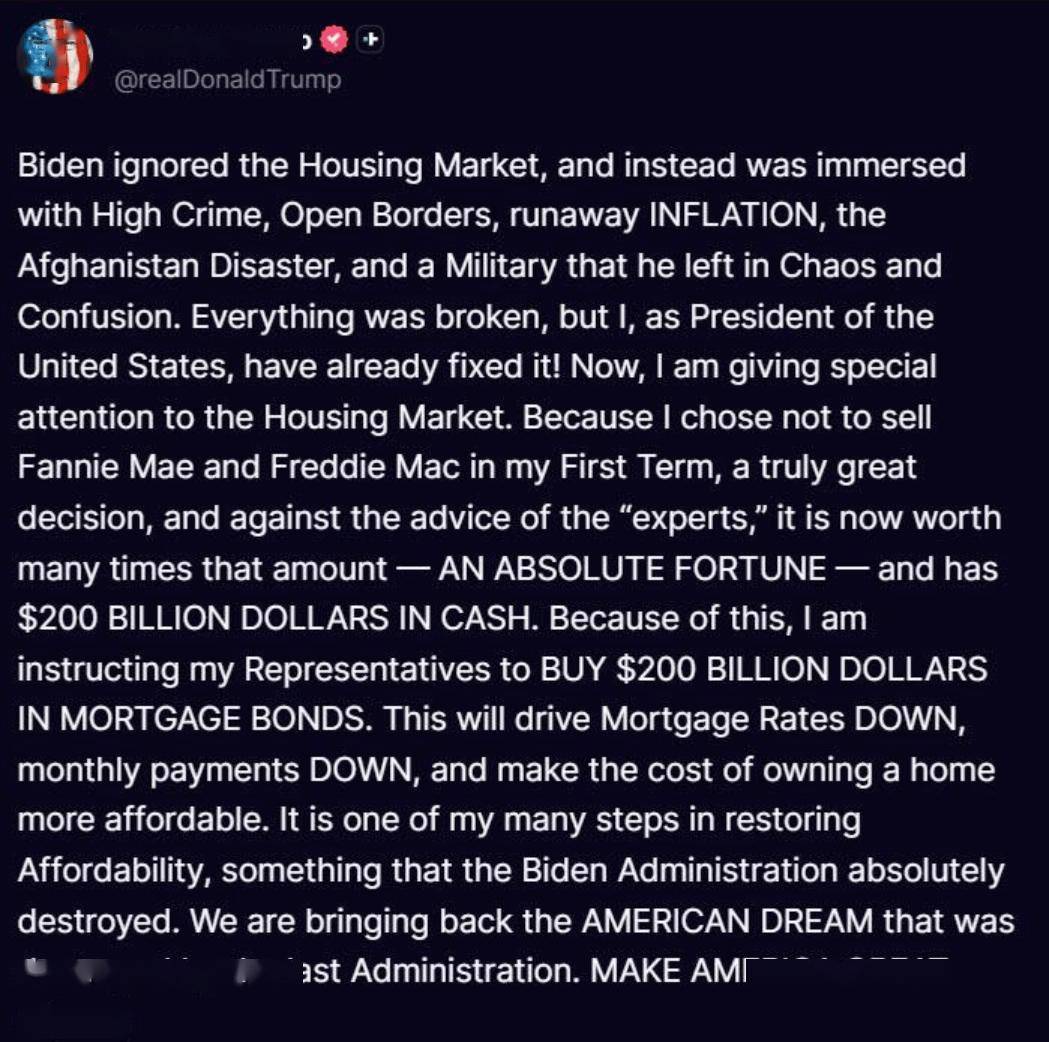 “此举将推动房贷利率下降、月供金额降低,从而提高民众的购房能力。”特朗普在周四下午写道,“这是我为恢复住房可负担性推出的多项举措之一,而住房可负担性恰恰是拜登政府一手摧毁的。”