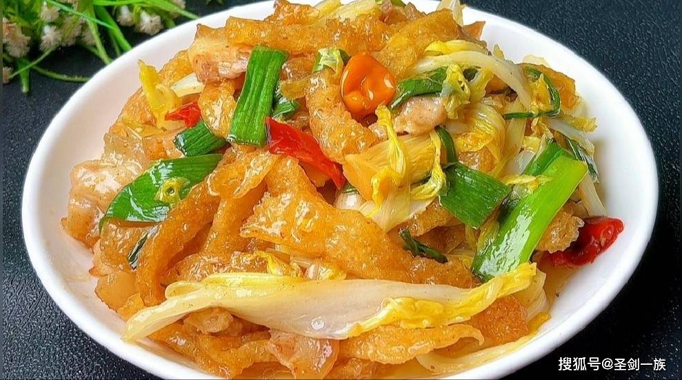 1. 猪皮提前用清水泡发,泡软后放入锅中,加水煮至熟透,捞出切成小块。
