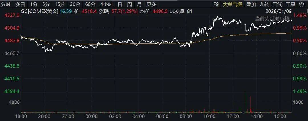 国际金银大涨,COMEX黄金期货涨1.29%,报4518美元/盎司,本周累计上涨4.34%。COMEX白银期货涨5.92%,本周累计上涨12.07%。