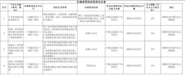 近日,中国人民银行广东省分行公布了对广东华兴银行股份有限公司及相关责任人的行政处罚决定,因违反多项金融监管规定,该行及3名时任相关职务人员均受到处罚,罚没款总计达374.25万余元,公示期均为5年。