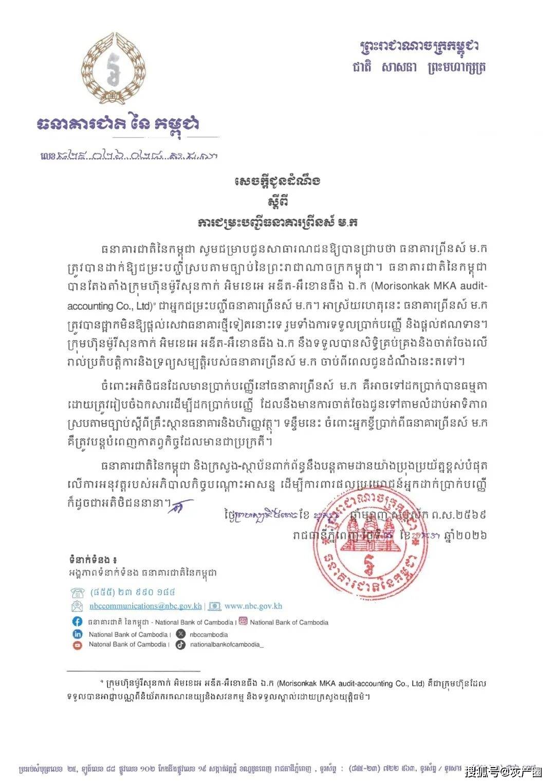 通告称,柬埔寨国家银行已指定 Morisonkak MKA 审计会计有限公司(Morisonkak MKA Audit-Accounting Co., Ltd.)担任太子银行清算人,全面负责清算期间的管理、处置及相关事务。