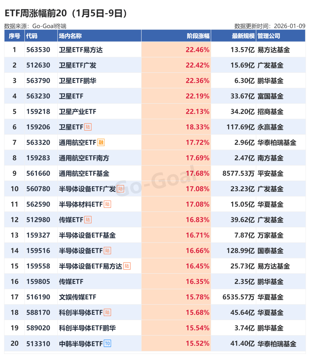 Go-Goal ETF数据显示,上周(1月5日至9日),科技成长风格占优,脑机接口、AI应用、商业航天、半导体等题材轮番表现。卫星ETF易方达单周涨幅达22.46%,涨幅居首。
