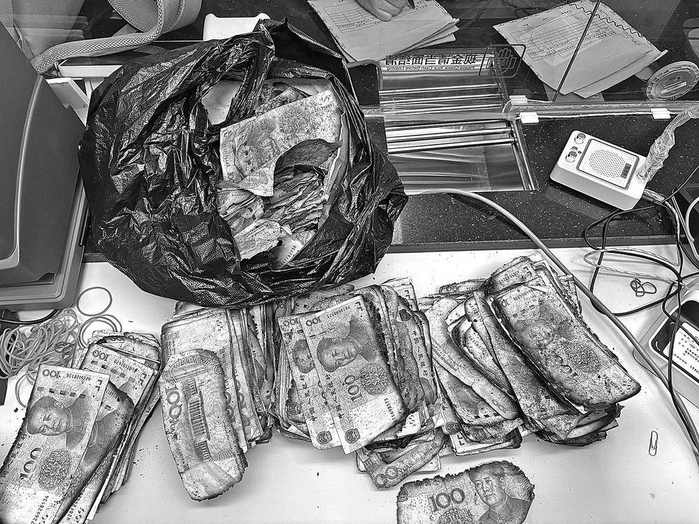 当日上午,神色焦虑的赵女士提着一个黑色布袋走进建行保山北城五洲支行营业厅。袋子里装的是家人刚从火灾现场“抢”出的积蓄——大量纸币已被烟火熏黑、粘连,有些纸币已经碳化。这笔钱能否兑换?如果可以,又能够兑换多少?面对不确定性,她满眼无助。