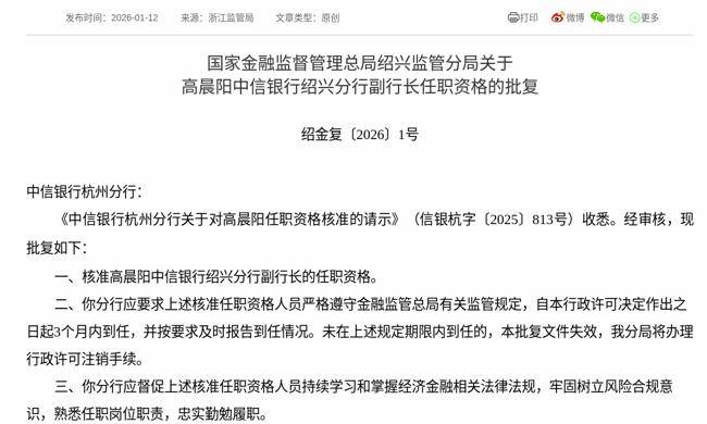 2026年1月12日,根据国家金融监督管理总局消息,《中信银行杭州分行关于对高晨阳任职资格核准的请示》获得通过,批复高晨阳中信银行绍兴分行副行长的任职资格。