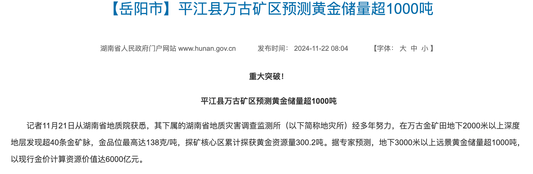 2024年11月下旬,湖南省地质院公布湖南平江县万古金矿田探矿获重大突破,在万古金矿田地下2000米以上深度地层发现超40条金矿脉,金品位最高达138克/吨,探矿核心区累计探获黄金资源量300.2吨。专家会商认为,湘东万古金矿田矿床规模属于超大型,预测地下3000米以上远景黄金储量超1000吨,以当时金价计算资源价值达6000亿元。