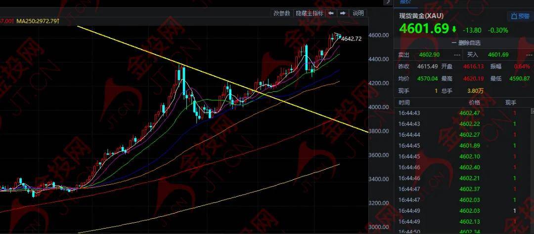 隔夜,现货黄金从周三的创纪录高点回落,收报4615.73美元,跌幅约0.2%。今日欧市盘中,黄金小幅下跌,目前在4601美元附近徘徊。
