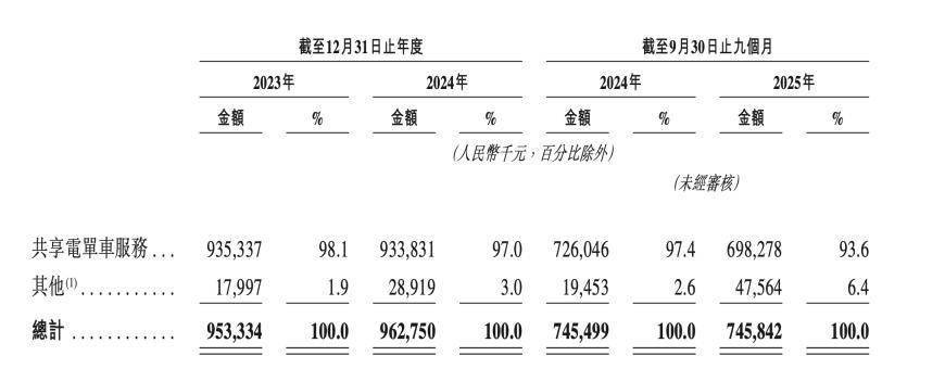 报告期内,其来自共享电单车服务的收入分别约9.35亿、9.34亿、6.98亿元,占比分别高达98.1%、97.0%、93.6%。
