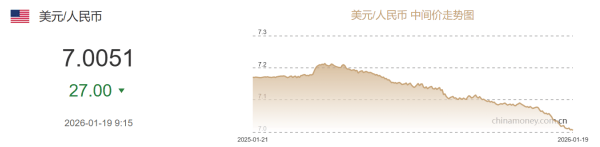 据中国外汇交易中心网站消息,2026年1月19日,人民币兑美元中间价报7.0051,调升27个基点,创逾32个月新高,前一交易日中间价报7.0078。