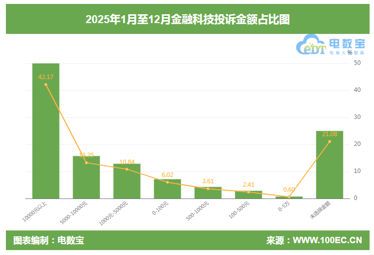 此外,2025年金融科技投诉金额分布比例为:10000元以上(42.17%)、未选择金额(21.08%)、5000-10000元(13.25%)、1000-5000元(10.84%)、0-100元(6.02%)、500-1000元(3.61%)、100-500元(2.41%)、0-5万元(0.60%)。