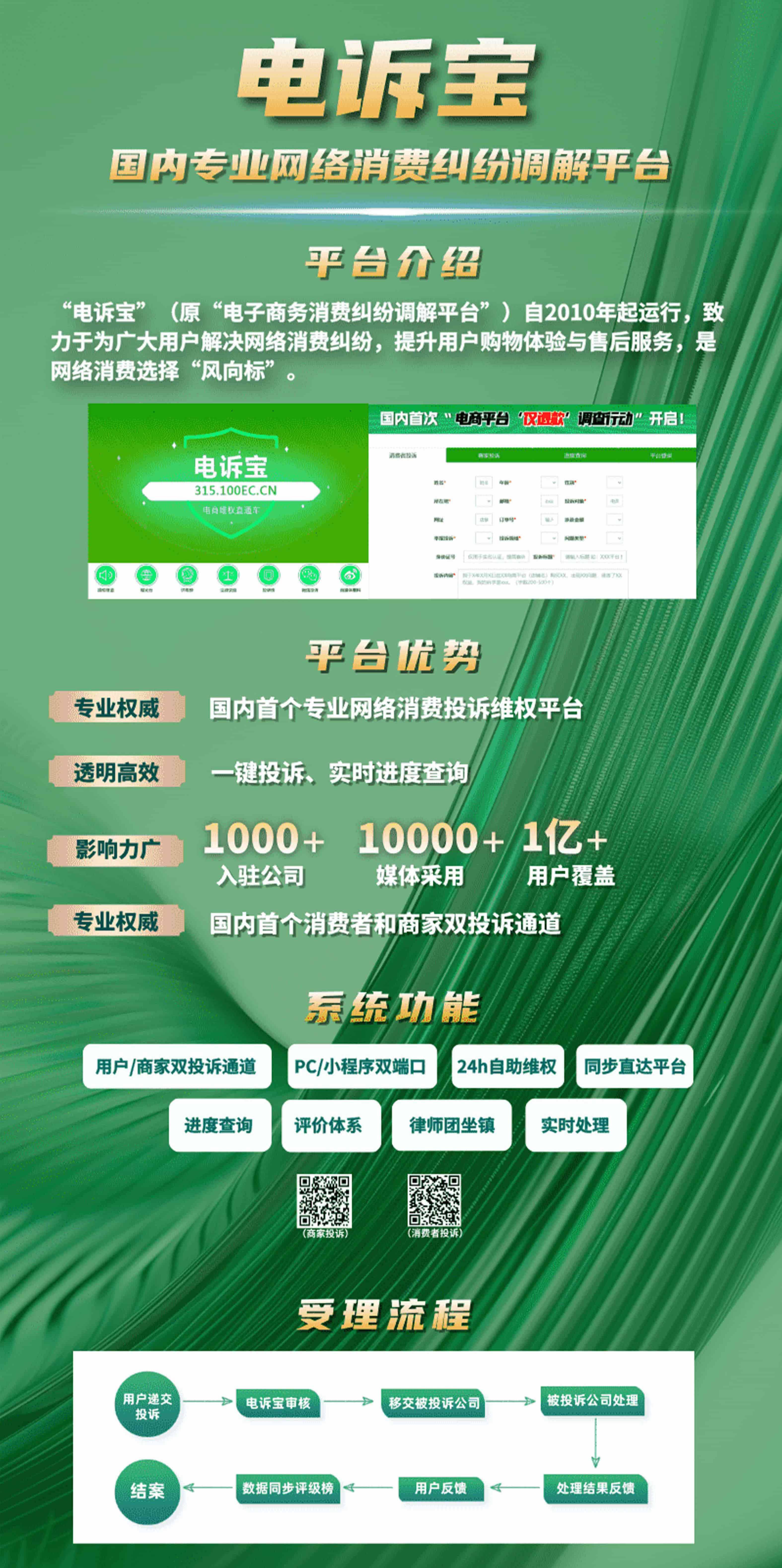 国内知名网络消费纠纷调解平台“电诉宝”运行13余年来,与全国近千家网络消费平台建立对接,影响1亿+网络消费用户,新系统实现一键投诉、24h在线、自助维权、同步直达、实时处理、进度查询、评价体系、法律求助、大数据分析等诸多功能。目前,平台“绿色通道”服务向广大网络消费平台开放,平台可自主申请入驻,实时受理、反馈和查询用户满意度评价。为了更好地营造公开、透明、健康的网络消费投诉环境,“电诉宝”公开版已正式上线,新增用户投诉实时受理动态、月度平台投诉量TOP10、热点投诉地区、投诉榜(依据投诉量排行)等模块,让投诉过程透明化,一手掌握信息动态。