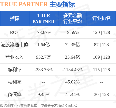 TRUE PARTNER港股市值1.64亿港元,在多元金融行业中排名第87。主要指标见下表: