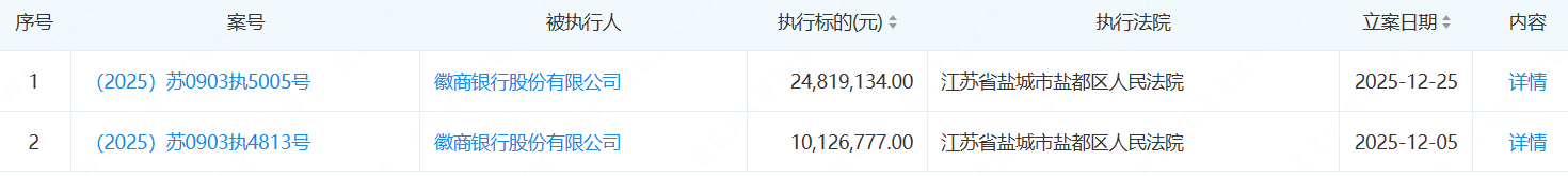 近期,徽商银行新增了2条被执行信息,引起市场关注。