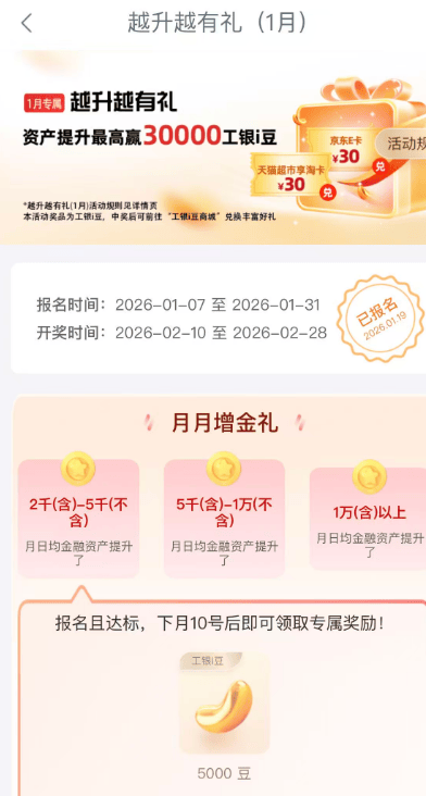 以工商银行为例,该行于2026年1月推出“月月增金礼”,活动根据月日均金融资产提升额设置2000元(含)-5000元(不含)、5000元(含)-1万元(不含)、1万元(含)以上三档,分别对应5000、16000、30000工银i豆奖励。金融资产包括个人客户在该行的本外币存款以及理财、基金、保险、国债等。