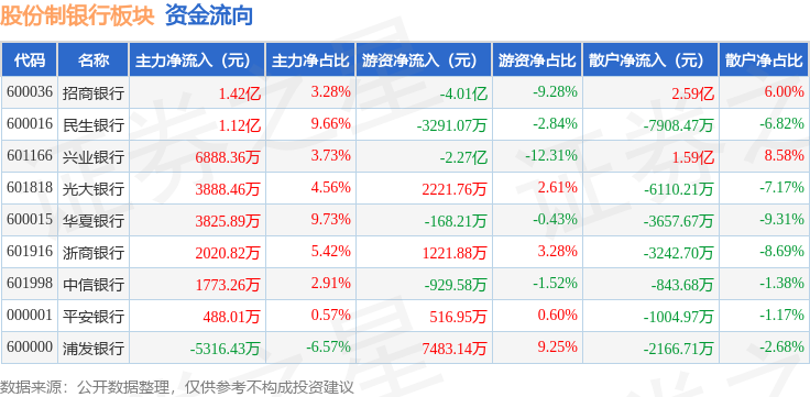 从资金流向上来看,当日股份制银行板块主力资金净流入3.9亿元,游资资金净流出5.58亿元,散户资金净流入1.69亿元。股份制银行板块个股资金流向见下表: