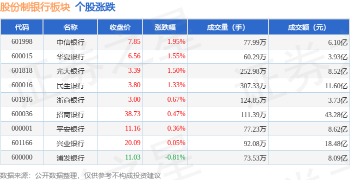 证券之星消息,1月20日股份制银行板块较上一交易日上涨0.54%,中信银行领涨。当日上证指数报收于4113.65,下跌0.01%。深证成指报收于14155.63,下跌0.97%。股份制银行板块个股涨跌见下表: