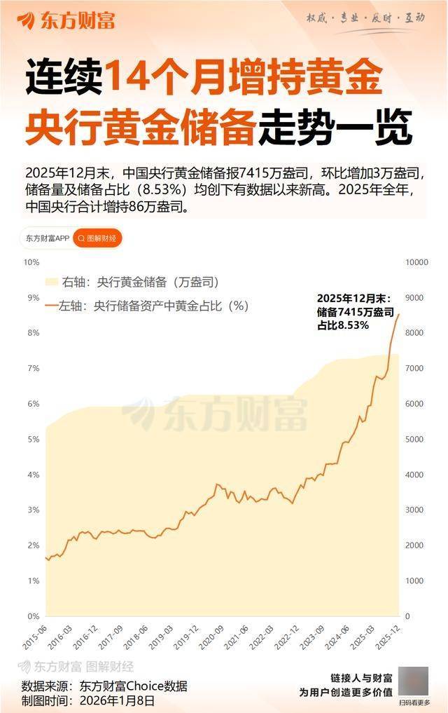 据媒体报道,“2025年12月我国央行继续增持黄金储备3万盎司至7415万盎司,全年累计增持86万盎司。”中银证券全球首席经济学家管涛认为,受量价推动影响,我国央行持有黄金储备余额占同期外汇储备余额的比重为9.51%,较上年末上升3.54个百分点,继续刷新历史新高,但仍低于全球平均水平。
