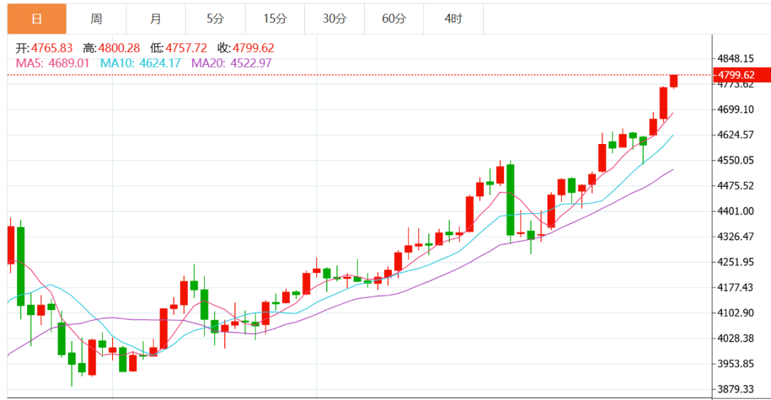 现货黄金历史首次升破4800美元/盎司整数关口,现涨0.75%,本月涨幅超10%。