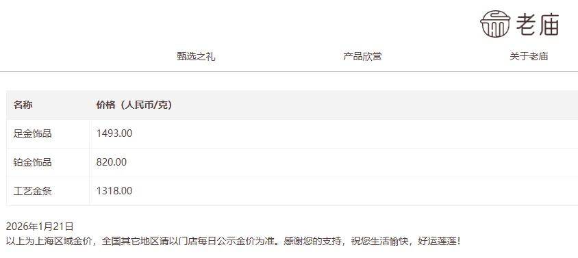 老庙黄金官网发布数据显示,足金饰品报1493元/克,较1月20日1455元/克涨38元/克 。
