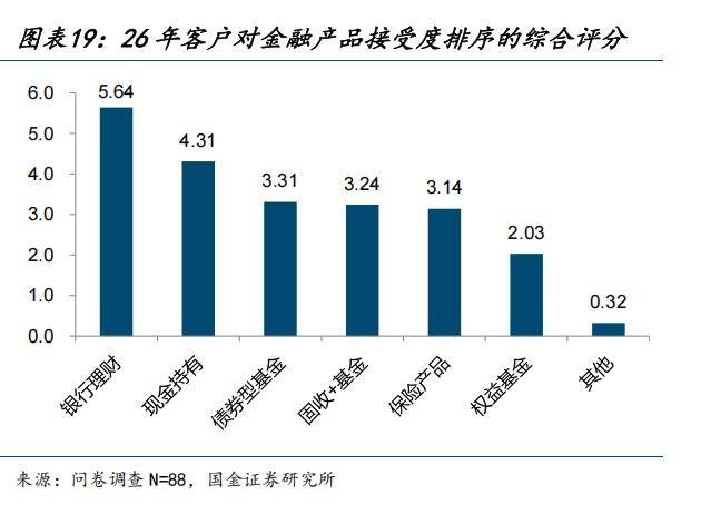 国金证券研报预计,存款到期客户对银行理财接受度最高,其次是现金持有,然后是债券型基金、固收+基金、保险产品,这三种产品接受度相当。