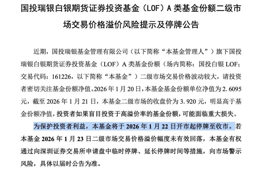 1月21日晚间,国投白银LOF基金(以下简称“本基金”)发布公告称,为保护投资者利益,本基金将于1月22日开市起停牌至收市。若本基金1月23日二级市场交易价格溢价幅度未有效回落,本基金有权通过向深交所申请盘中临时停牌、延长停牌时间等措施,向市场警示风险。