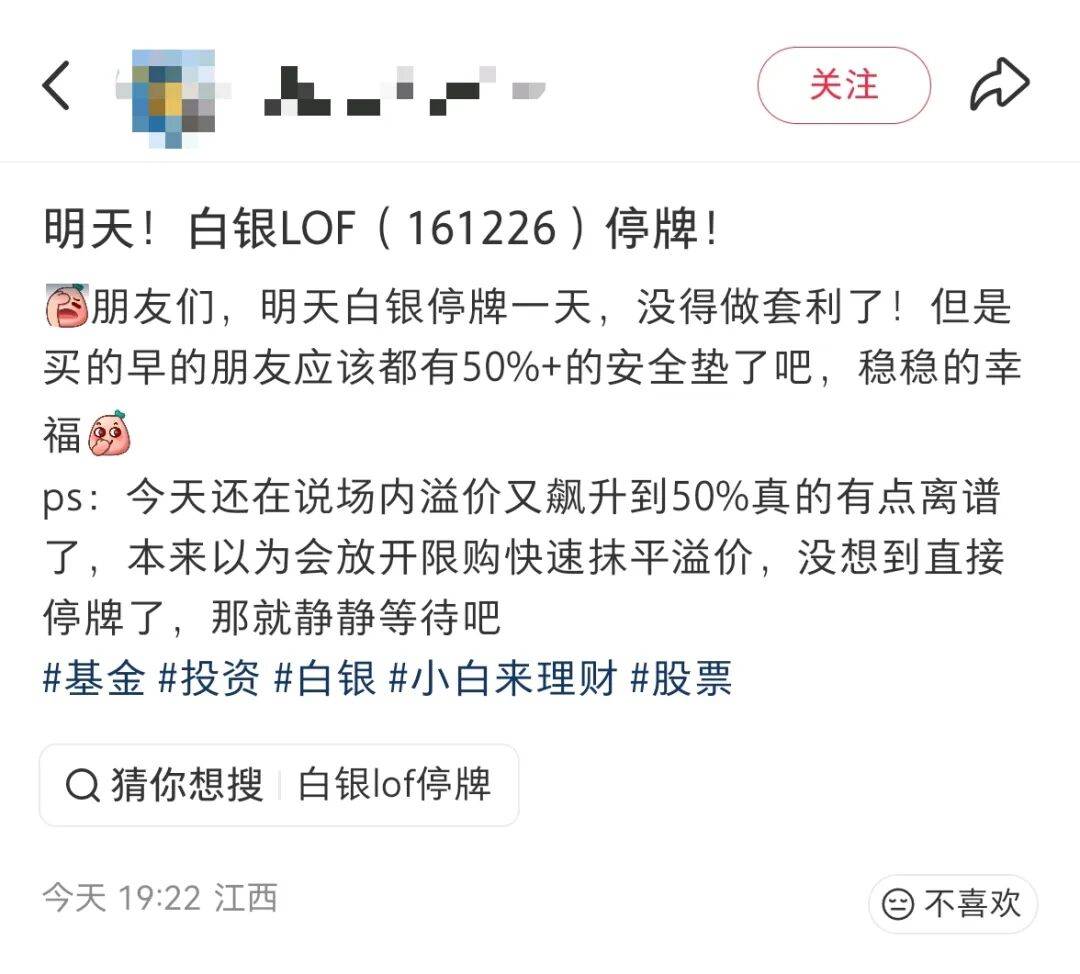 在溢价率未能有效回落的情况下,国投白银LOF祭出全天停牌的大招。
