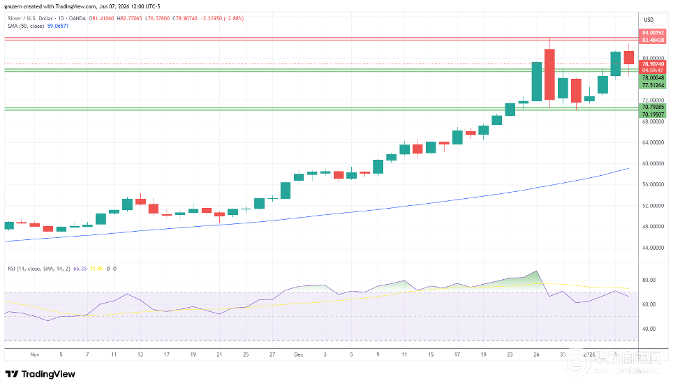 如果成功测试77.50-78.00美元支撑位,则将推动白银向下一个支撑位70.20-70.80美元前进。