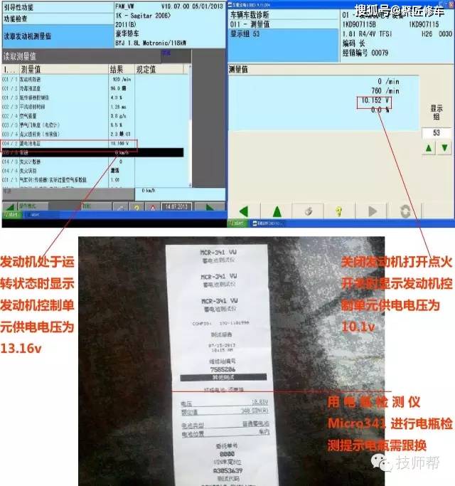 7、清除故障后启动发动机读取发动机控制单元供电情况显示13.16v,但在熄火后显示只有10.1v,显然蓄电池电压确实不正常。用电瓶检测仪 Micro341对电瓶进行检测,提示需跟换电瓶;