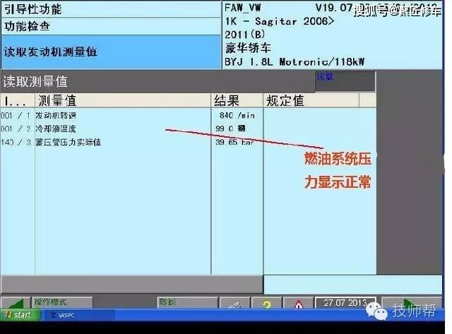 3、连接燃油压力表在故障状态下读取燃油压力为39.6bar处于正常状态数据流中的数据一致。接着对传动部分各部件及发动机和变速箱固定部件进行检查,也未发现异常;