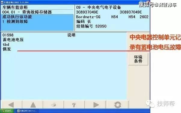 6、接下来再次对车辆进行全面自诊断检测,发现中央电器控制单元报有故障码 01598(电瓶电压偶发),但起动机能正常启动车辆而且无电压不足的现象,估计之前亏过电导致的;