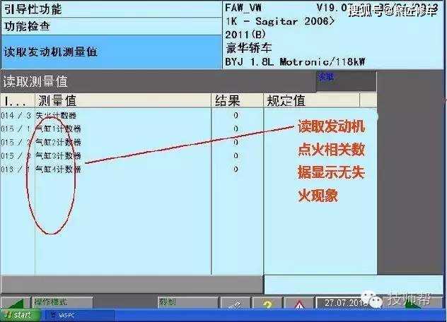 2、首先连接诊断仪VAS6150对发动机系统进行自诊断检测,显示无任何故障记录。可以初步判定发动机电控系统连接线路及相关部件基本正常;同时对发动机系统第14、15、16组数据进行读取,未发现失火现象和失火记录,点火性能正常;