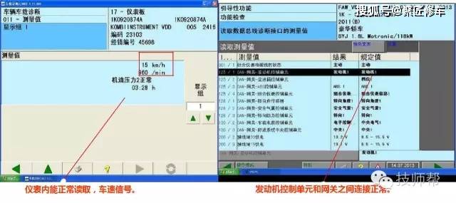 8、更换电瓶后,故障排除,此时读取数据能正常显示车速信号,熄火后控制单元供电为 12v。