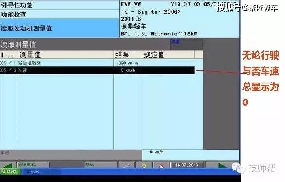 5、进一步对ABS、仪表等控制系统进行数据读取,发现能正常读取行驶车速数据。因车速信号是由ABS控制单元通过驱动CAN总线进行数据传输的,仪表里能正常读取车速信号证明车速信号的采集和传输都正常;而且通过读取网关里的各控制单元与网关的总线连接状态,显示发动机控制单元连接正常。于是怀疑发动机控制单元内部故障、不能正常接收或正确识别ABS传递的车速信号。随即更换发动机控制单元,可更换发动机控制单元后故障还是未能排除;