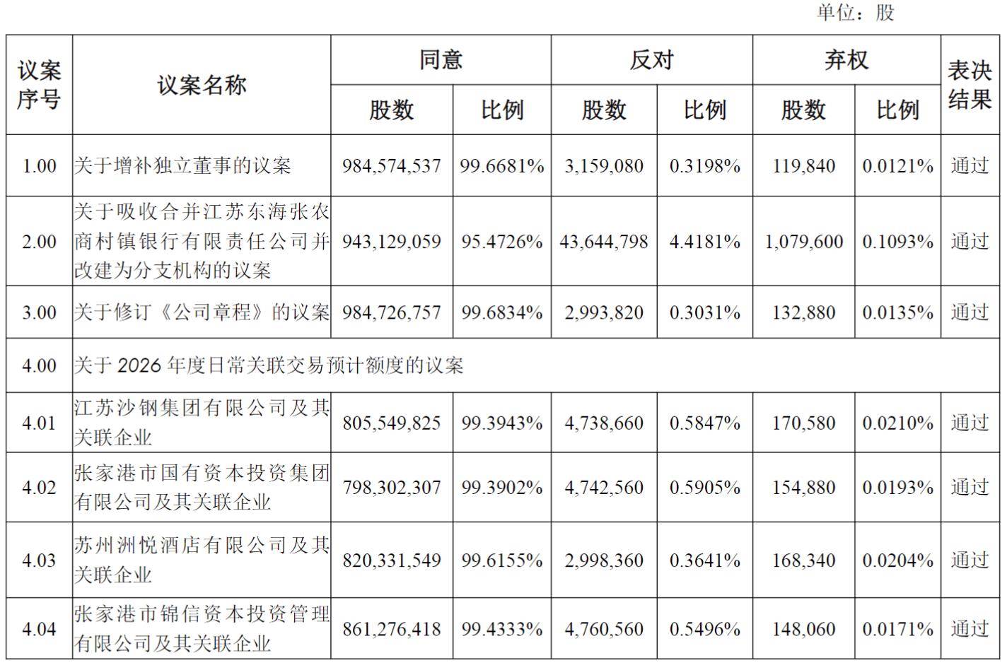 1月21日,江苏张家港农商行发布2026年第一次临时股东会决议公告,会议审议通过了《关于吸收合并江苏东海张农商村镇银行有限责任公司并改建为分支机构的议案》。