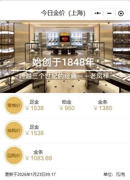 老凤祥上海会员中心小程序发布数据,足金饰品报1538元/克,较1月22日上涨超40元/克 。