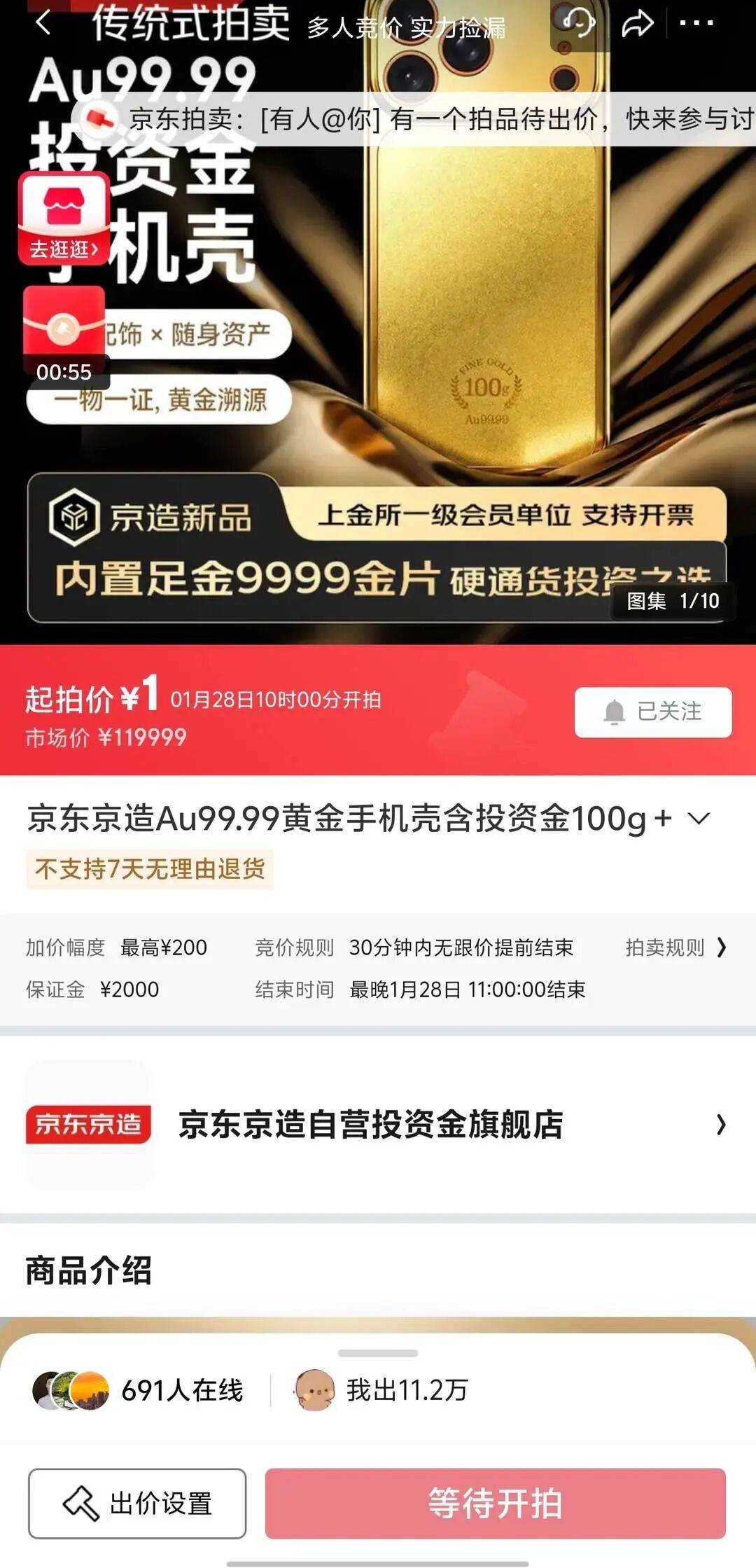 近日,有电商平台售卖黄金手机壳引发网友关注。1月23日,记者前往网上店铺发现,有价值约12万元的100克黄金手机壳,以起拍价1元的低价拍卖,每次加价最高200元,目前距离起拍还有5天,已经有81人交纳2000元保证金预约拍卖。
