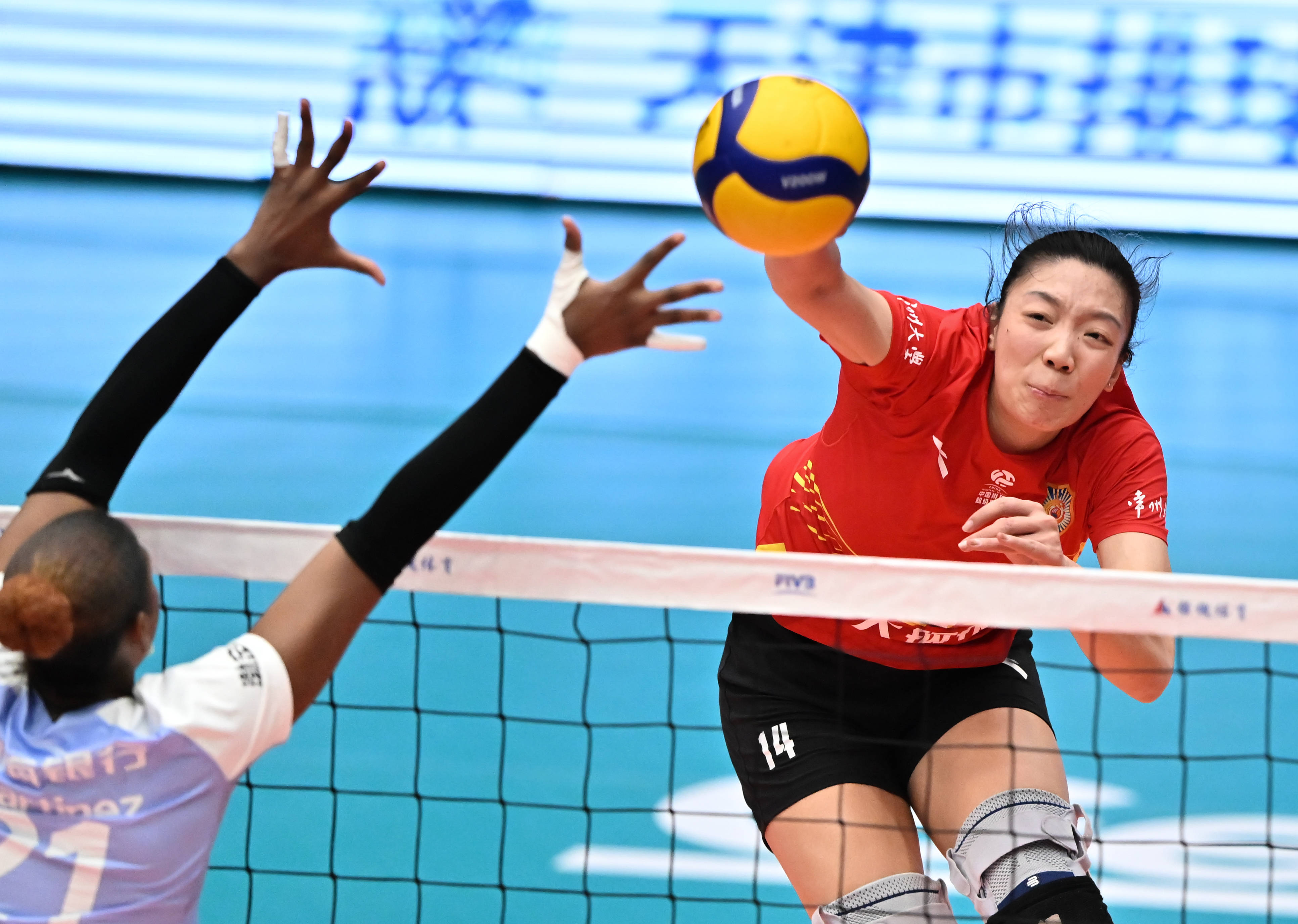 1月24日,天津渤海银行队球员娜塔莉亚·佩雷拉(右)在比赛中扣球。 新华社记者 孙凡越 摄
