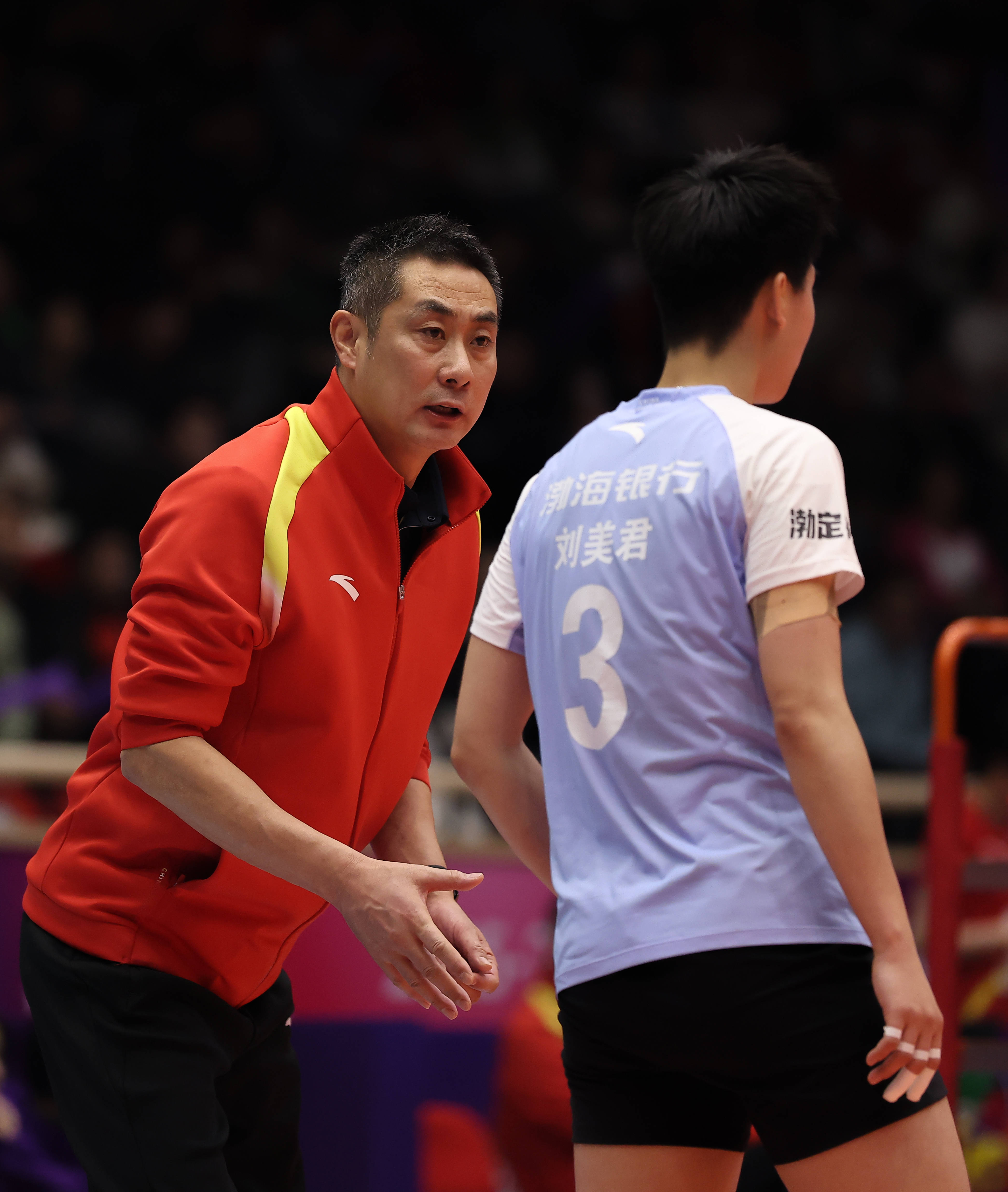 1月24日,天津渤海银行队主教练陈方(左)在场边指导球员刘美君。 新华社记者 孙凡越 摄