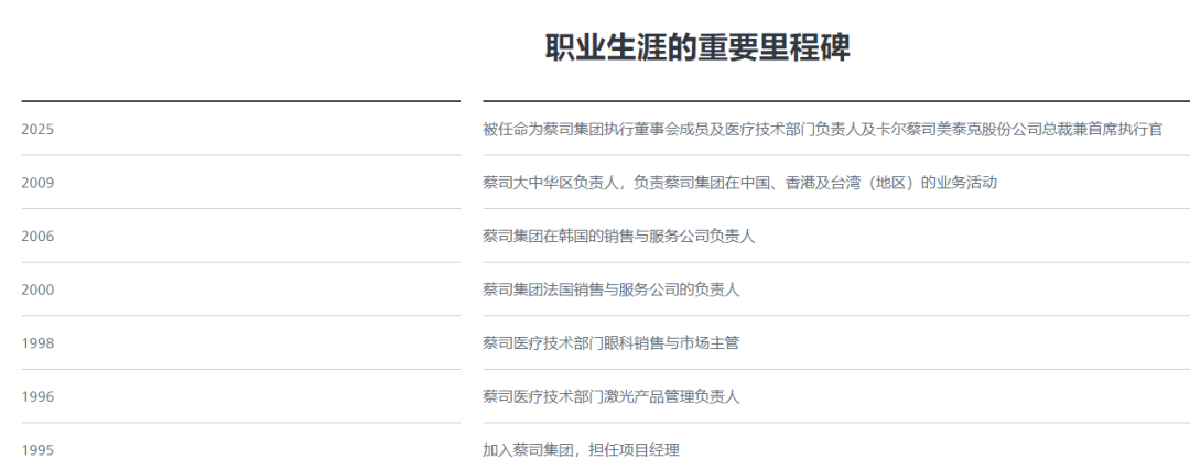 现年58岁的福斯特,堪称蔡司的“中国通”和功臣。他于1995年加入蔡司,自2009年起执掌蔡司大中华区长达16年,正是中国医疗市场飞速发展的黄金时期。他深度参与了蔡司在中国从高端光学产品到外科显微镜、眼科诊断设备、乃至近视矫正等全系列医疗业务的战略布局与市场扩张,功不可没。因此,他在2025年6月升任全球医疗业务CEO,被视为对其功绩的肯定和能力的认可。