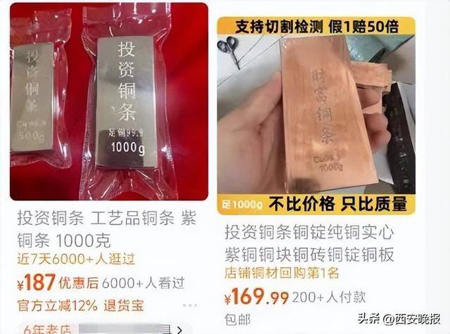也有商家表示,自己售卖的投资铜条价格为187元,“工艺品铜条,紫铜条,1000g”。此外,记者发现部分产品已有200+人付款,还有产品已有6000+人看过。