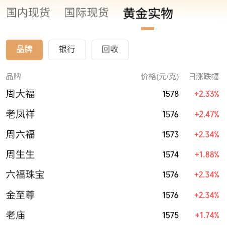 国内品牌金饰克价同样行至历史高位,接近1580元/克。1月26日,老庙黄金足金饰品报价1575元/克,较昨日上调22元/克;周生生金饰价格今天上调至1574元/克,较前一日1551元/克的价格上涨23元;周大福金饰报价1578元/克,较前一日上调25元/克。