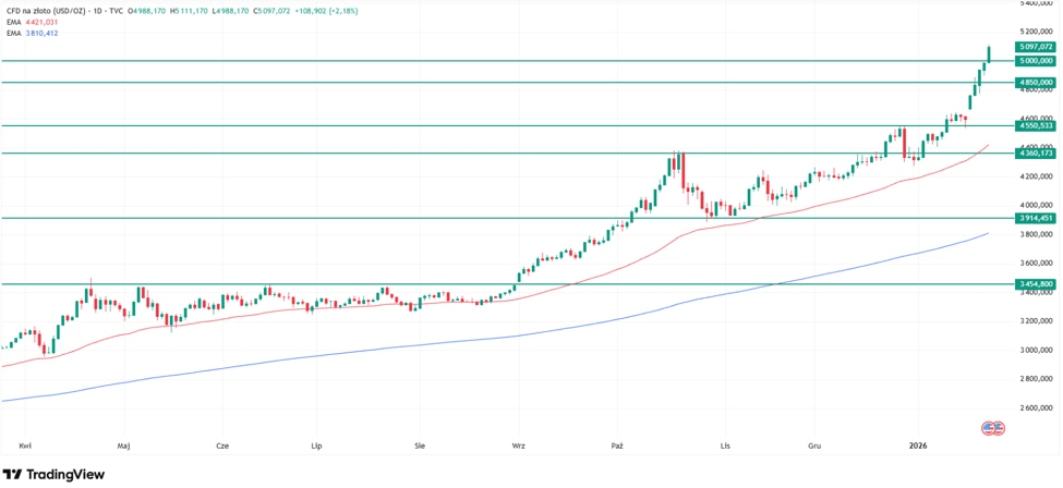 图表显示,此前4850美元阻力位已转化为新支撑位,若当前上涨态势延续,5000美元关口可能成为新的价格底线。不过,在当前价格波动阶段,金价后续走势仍较难预测。