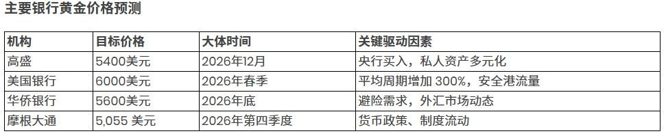 摩根大通则表示,根据货币政策与机构资金流向,2026年第四季度目标价为5055美元。