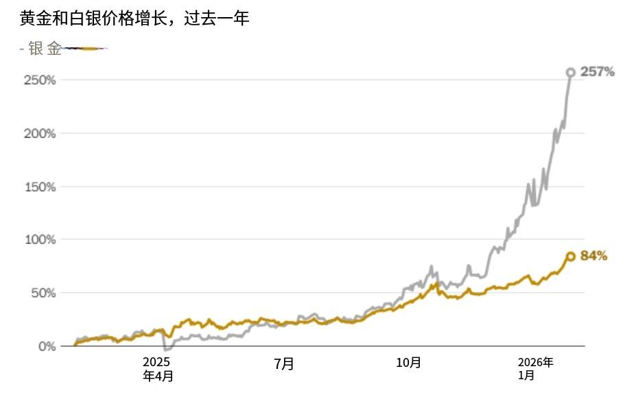白银表现远超黄金,目前在107.5-110美元区间交投,2026年迄今暴涨53%,延续2025年50%的涨幅,实现连续九个月上涨。相较于2025年5月本轮行情启动时的33美元,白银在九个月内价格已翻三倍有余。