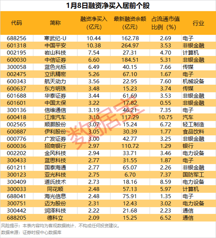 具体到个股,1月8日获融资净买入1亿元以上的有74股,其中,6股融资净买入额均超5亿元。
