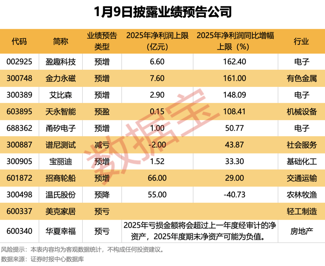 盈趣科技、金力永磁、艾比森等业绩预增且预计2025年净利润同比增幅上限超100%。