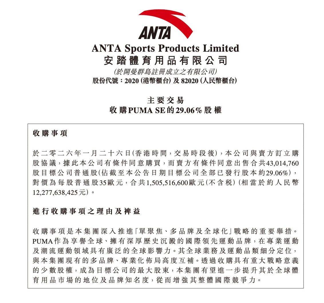 1月27日,安踏体育(02020.HK)发布公告,拟以现金支付方式收购德国运动品牌Puma(彪马)所属公司Puma SE的29.06%股权,涉及4301万股普通股,交易对价为每股35欧元,总额达15.06亿欧元(约合122.78亿元人民币)。交易完成后,安踏将成为彪马的最大股东。消息公布后,安踏体育股价早盘一度涨超3%。