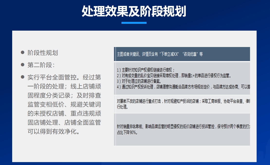 分析与处理:人工分析违规情况,分类处理(授权店铺约束,未授权店铺下架或整改)。